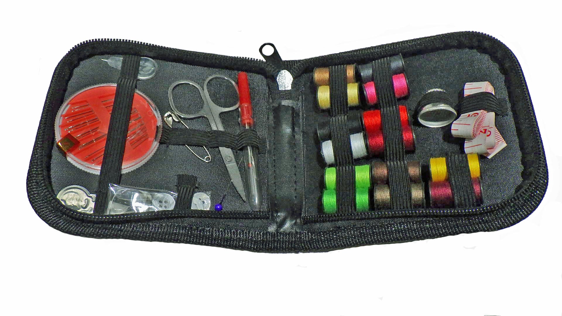 Our mini sewing kit comes with a selection of polyester threads and sewing needles plus scissors, thimble and tape measure. There is even a spare button for that travel emergency!!